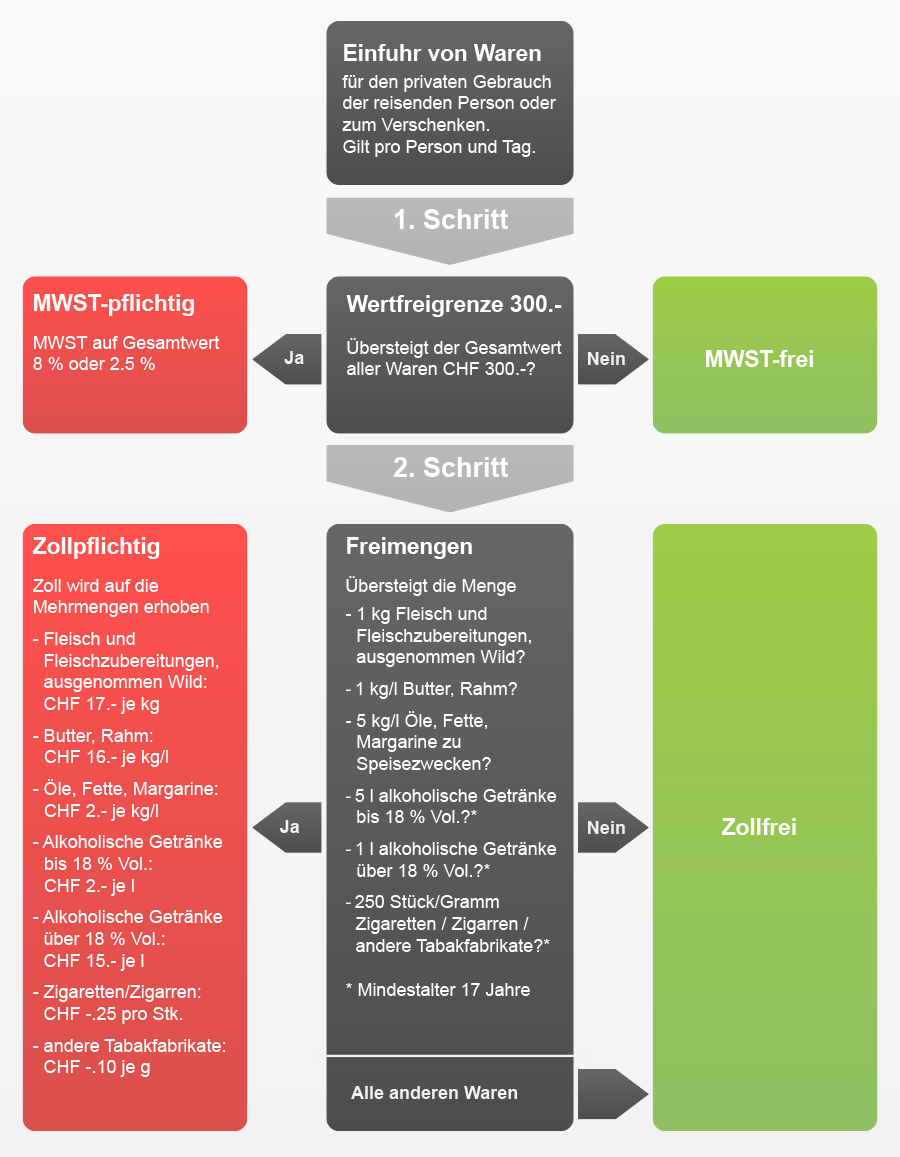 Mehrwertsteuer:Die Wertfreigrenze von CHF 300 gilt nach wie vor. Neu sind auch alkoholische Getränke und Tabakfabrikate der Gesamtmenge anzurechnen.