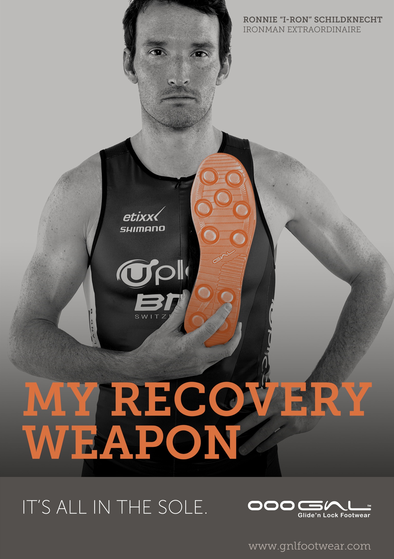In 1975 long before walking and jogging were popular sports, a young Swiss engineer named Hans-Georg Braunschweiler, who’s accumulated miles equalled running around the world twice, wondered why the soles on his shoes wore off so quickly and why landing in sand and snow was made with such ease, yet the push-off was so exhausting. Therefore he developed together with the Swiss Triathlete and Duathlon World Champion Olivier Bernhard the Glide ‘n Lock™ (GnL) running shoe, an invention that felt like landing in sand, but pushing from concrete.