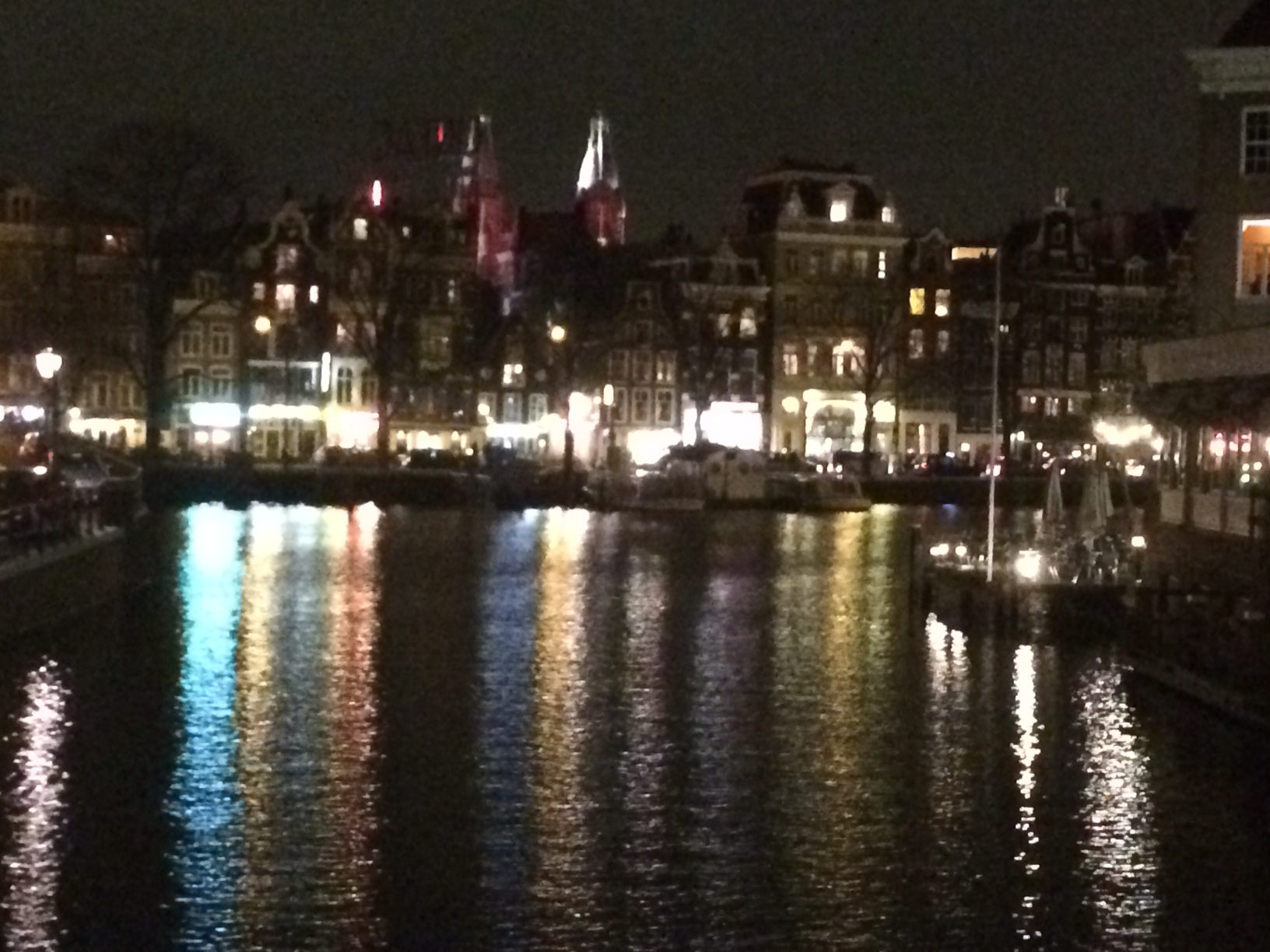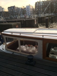 Yesterday I had dinner on a small boat in Amsterdam. The roof and the sides were of glass so that we had a wonderful view all around. The boat was small, for about 25 people and there was no kitchen, only a bar. Thus for every course the boat had to dock at the bank at a restaurant, so that the course could be served. The sun went down, light mirrored on the water and in combination with the private live behind the windows of the house boats lining the canals this was a fantastic spectacle.
