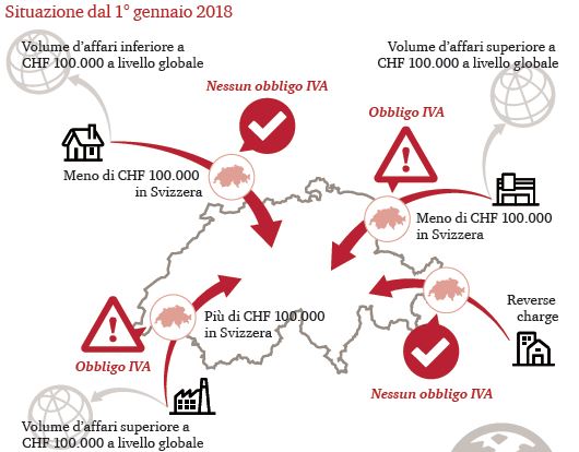 Di conseguenza, un’impresa estera che realizza un volume d’affari di meno di CHF 100.000 in Svizzera ma di almeno CHF 100.000 a livello globale, sarà obbligata a registrarsi in Svizzera a partire dal 1°gennaio 2018 ancor prima di eseguire la prima operazione; - i soggetti non residenti che effettuano esclusivamente prestazioni di servizi soggette all’imposta sull’acquisto (c.d. “reverse charge”) in Svizzera, sono esonerati dall’obbligo di registrazione indipendentemente dal volume d’affari ottenuto;