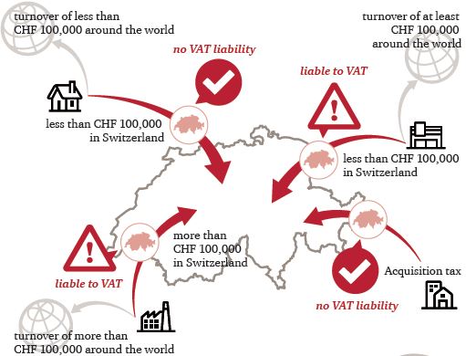 - Tax liability for foreign companies, which supply goods to Switzerland or provide end users with telecommunication and electronic services, will no longer be calculated based on the turnover generated in Switzerland, but rather on the turnover generated worldwide. Accordingly, if a company generates less than CHF 100,000 from services of this kind in Switzerland, and at least CHF 100,000 in turnover around the world, it will from 1 January 2018 be liable for VAT in Switzerland from the first franc of turnover.