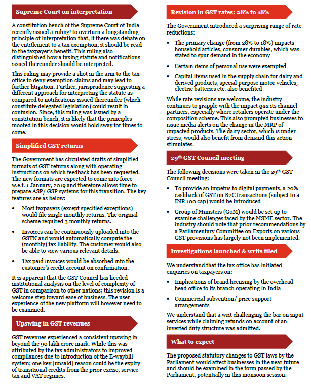 Tax Knowledge India: GST latest update August 10, 2018August 10, 2018 Michaela MerzLeave a comment What has happend the last two weeks regarding GST? Find out more about the Supreme Court of India, draft of simpliefied formats of GST returns, different figures and numbers of GST and what to expect in the near future. Bildquelle: Dieter Schütz / pixelio.de Share this: Click to share on Facebook (Opens in new window) Facebook Click to share on LinkedIn (Opens in new window) LinkedIn Click to share on X (Opens in new window) X Click to share on WhatsApp (Opens in new window) WhatsApp Click to email a link to a friend (Opens in new window) Email More Click to print (Opens in new window) Print Click to share on Reddit (Opens in new window) Reddit Click to share on Tumblr (Opens in new window) Tumblr Click to share on Pinterest (Opens in new window) Pinterest Click to share on Pocket (Opens in new window) Pocket Click to share on Telegram (Opens in new window) Telegram Like Loading... Related