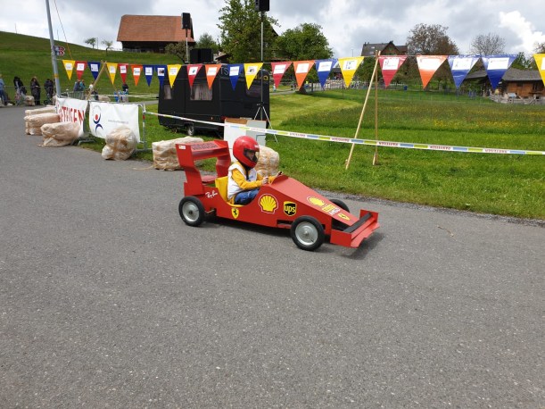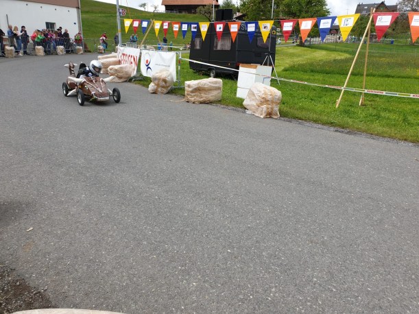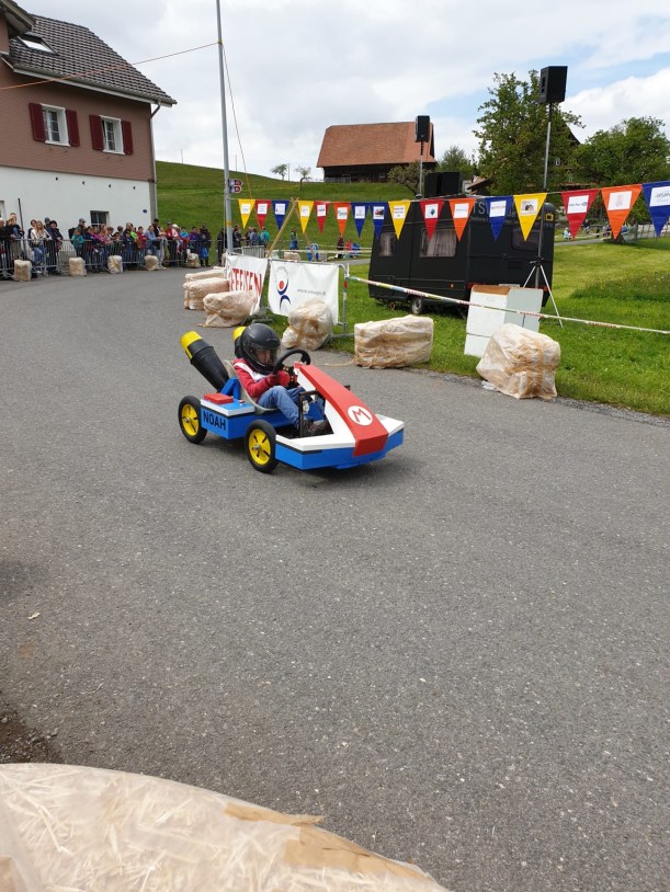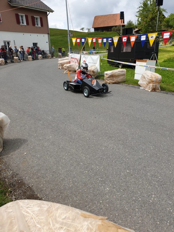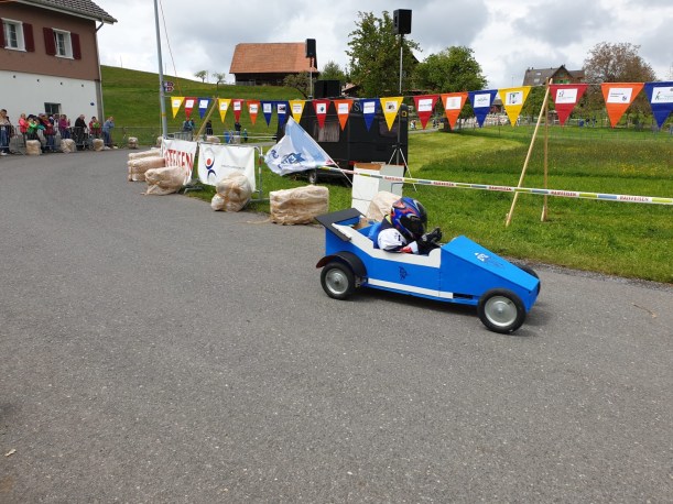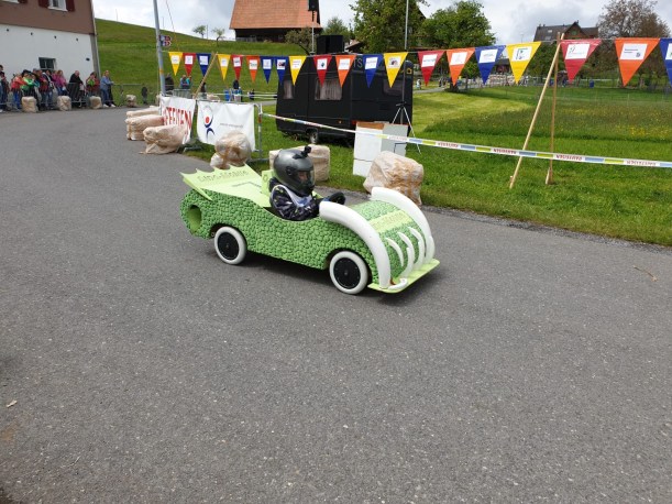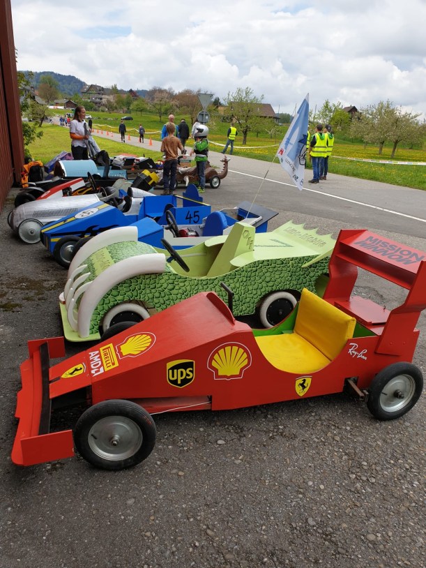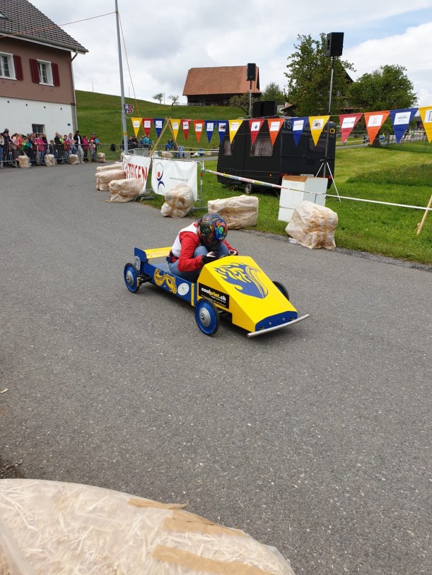 Die Rennstrecke hatte alles was es zu gute Atmosphäre braucht. Ein Grill mit Cervelat und Bratwurst. Getränke um nicht zu verdursten, ein Glaceverkäufer, viele Fans. Gott sei Dank hat es nicht geregnet, auch wenn es bewölkt war. Die kleinen Rennfahrer waren mit dem Herz voll dabei. Wir haben uns in die “Jogurtenkurve” (die Kurve bei der Molkerei) platziert, dort wo man zwei Sekunden verschenken oder herausholen konnte, die am Ende um einen Podestplatz entscheiden konnten. Bestimmte Autos sind gemütlich reingefahren und es war von vornherein klar, die sind einfach dabei aber mit wenig Ambitionen auf Sieg. Der Kampf um den Podestplatz wurde jedoch gnadenlos geführt. Einige sind sehr rasant in die Kurve reingerast und haben die Kurve sehr eng geschnitten um das Maximum herausauszuholen. Das hellblaue Rennauto hat die Kurve so eng geschnitten, dass es teilweise nur auf zwei Rädern gefahren ist. Wir staunten über den Kampfgeist und der Kreativität der Produzenten der Fahrzeuge. Jedes von ihnen ein Unikat, wahrscheinlich hergestellt in langen Stunden. Der Fantasie waren keine Grenzen gesetzt, ausser dass man ein Steuerrad und Bremsen haben musste.