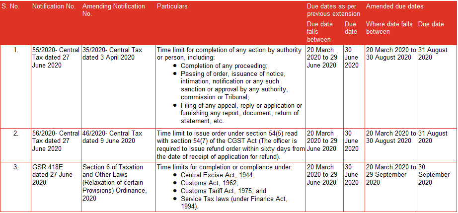 Recently, the Central Government has issued Notifications on 27 June 2020 to further extend the deadlines for various compliances, procedures and applications under the Central Goods and Service Tax Act, 2017 (CGST Act). The below table summarises the extended deadlines.