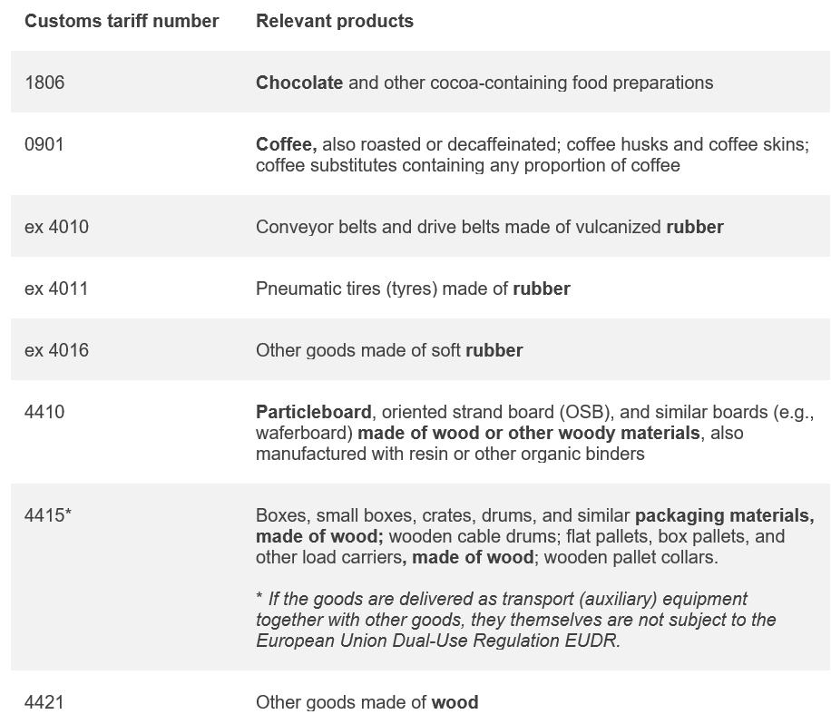 “relevant commodities” (product groups) according to the regulation include cattle, cocoa, coffee, oil palm, rubber, soy, and wood. However, “relevant products” encompass a variety of products from various customs tariff chapters, including, for example (but not limited to):