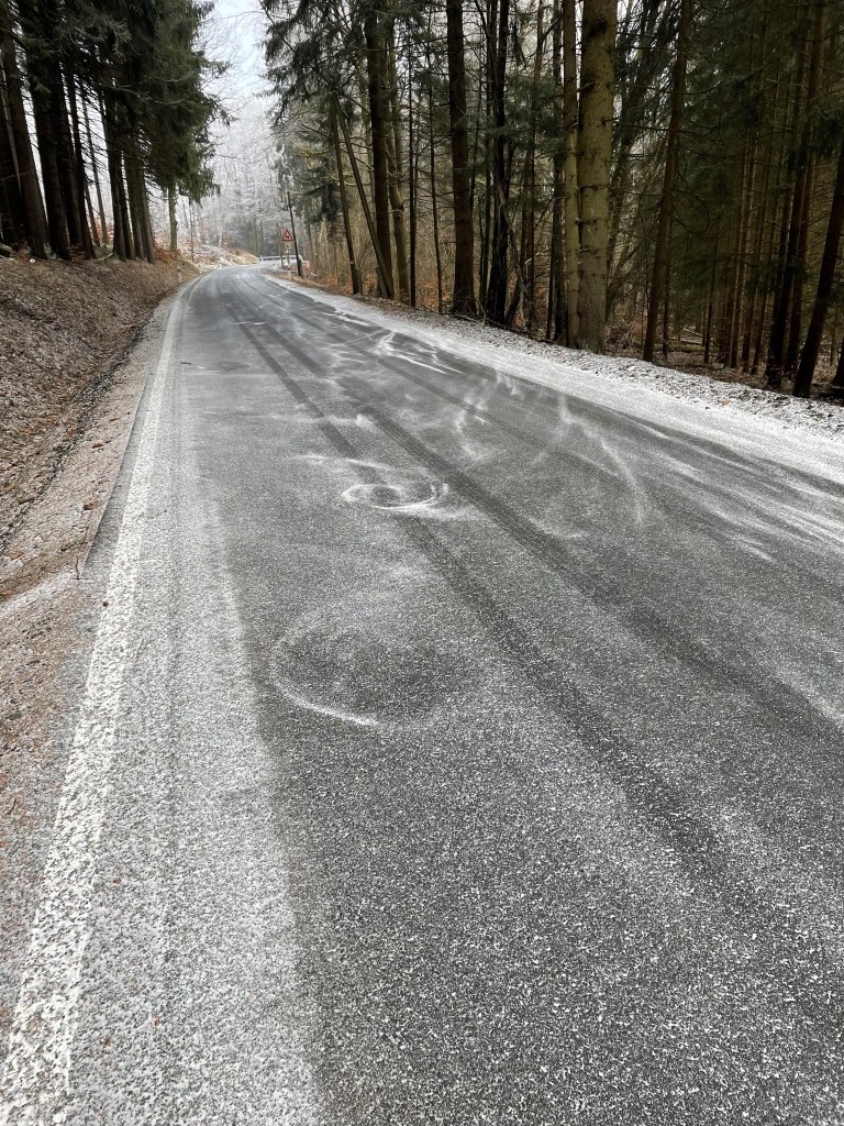 We run. The dog is much faster than I am. But he’s not stupid and doesn’t want the collar to painfully tighten around his neck. So, he adapts to my pace without much trouble. As the mountain gets steeper, he keeps adjusting his speed to mine. Clever animal! The only annoying thing is that at the start, he runs from left to right and back again, which doesn’t make it any easier for me. Of course, he has to mark a lot of spots, but he’s so fast and the leash is so long that it hardly bothers me. After a kilometer, we’re a well-coordinated team. The forest is frozen, quiet and seems deserted. In the silence, though, you can hear the faint sounds of the wood. Otherwise, no animals, no chirping, no voices in sight. Then, about halfway, a man suddenly appears out of nowhere with a basket. I think to myself, this is almost like the fairy tale “Marie and the Twelve Months.” In that story, Marie was sent deep into the forest in the middle of winter by her evil stepsister to collect flowers. Who could have sent this man? What could he be collecting? I stop and ask him. He says he’s collecting mushrooms and shows me a few mushrooms that barely cover the bottom of his basket. I can hardly believe it. I didn’t think there were mushrooms that could be collected in midwinter. You can always learn something new.