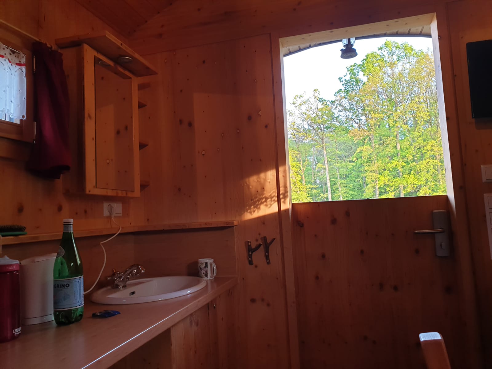 Our shepherd’s wagon has TV. That was also not necessary, not once did we switch it on. We had no cups, but five wine glasses and no toilet, which one misses even more when one has to walk through the forest in the middle of the night.